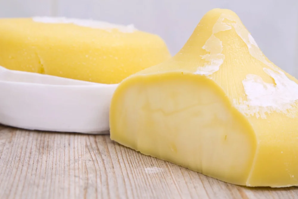 Pasta filata can be used to make many different shaped cheeses. Scamorza and caciacavallo are both Italian pasta filata cheeses with a similar shape, but scamorza is a younger cheese, whereas caciocavallo can be aged.