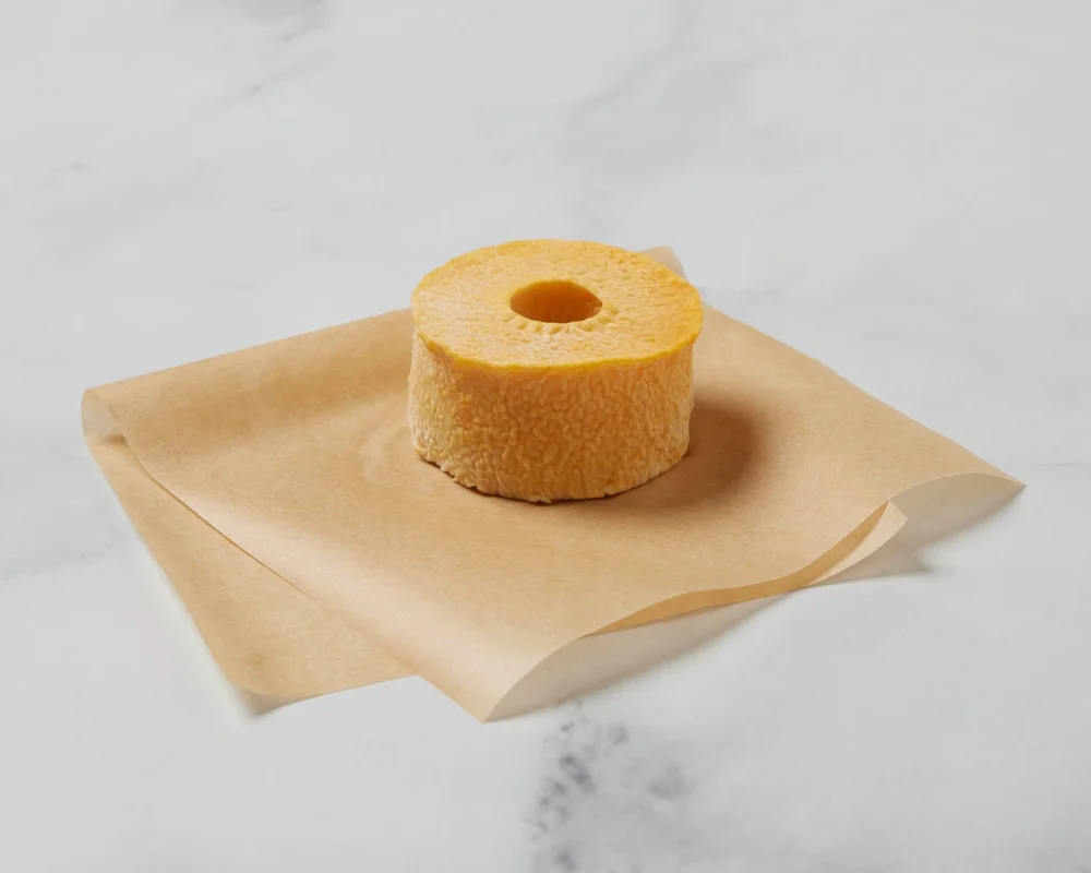 Hooper is a soft, creamy cheese made with cow’s and goat’s milk and washed with a French gray sea salt brine. The donut shape helps the cheese age evenly. The rind’s color transitions from cream to golden to orange as the cheese ages, and it offers fruity, funky, and buttery flavor notes.