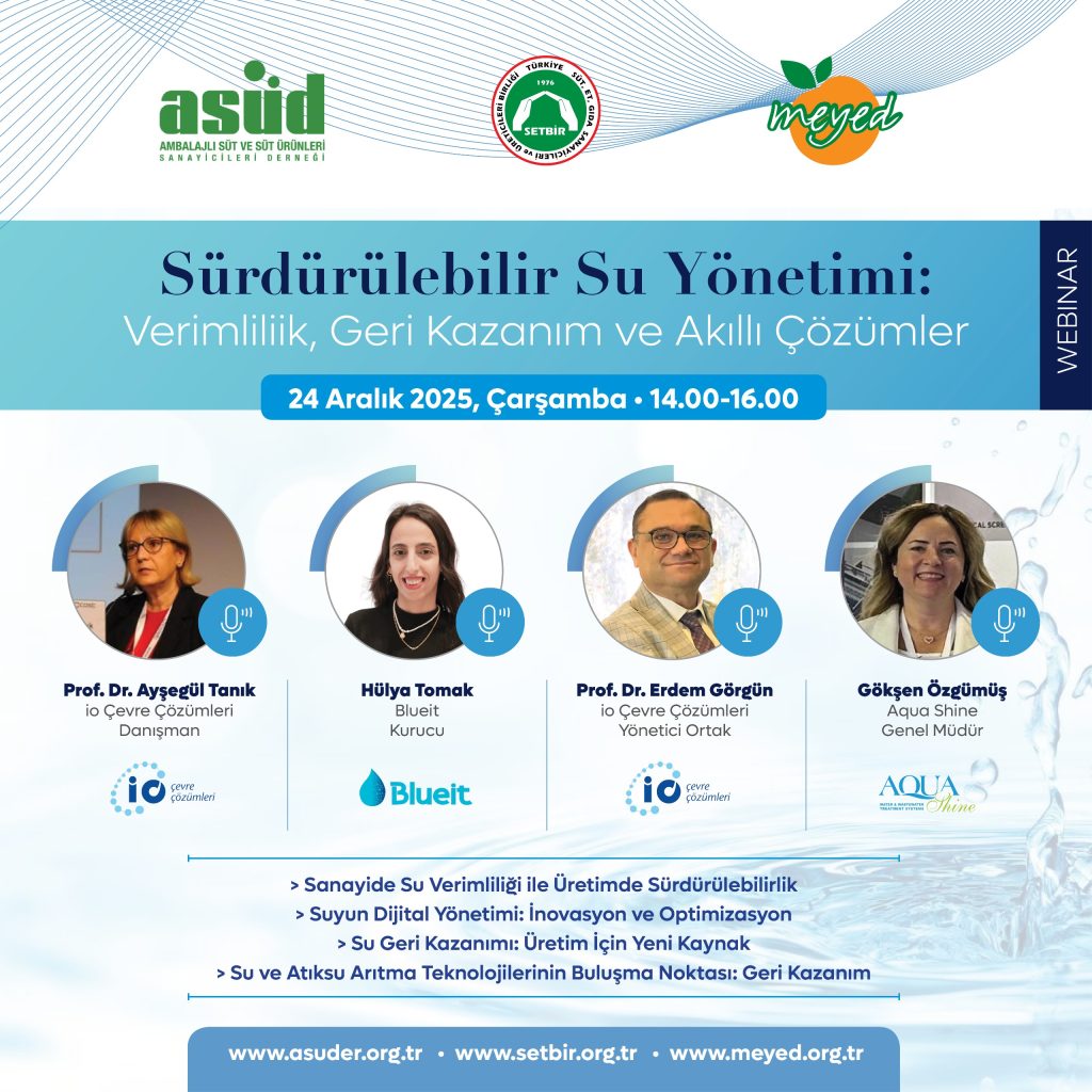 Bu çerçevede ASÜD, SETBİR ve MEYED iş birliğiyle düzenlenen bu webinar; sektör paydaşlarına üretimde su yönetimine ilişkin güncel yaklaşımları, uygulanabilir teknolojileri ve iyi uygulama örneklerini bütüncül bir bakış açısıyla sunmayı amaçlamaktadır.